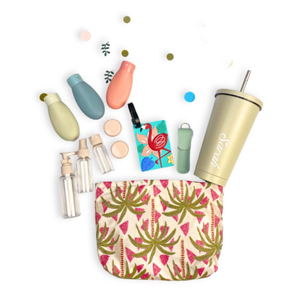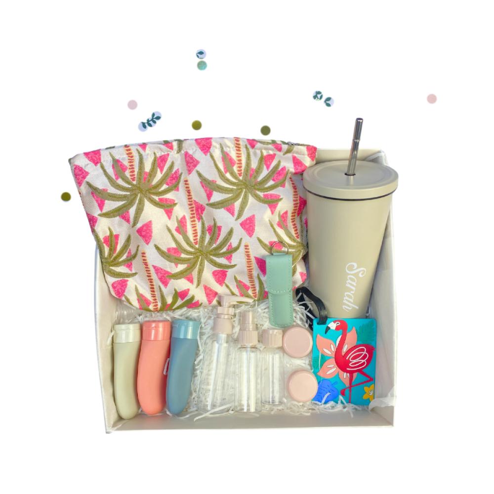 المحتوياتحقيبة مكياج بنقوشات نخلتاق حقيبة سفرمجموعة عبوات السفركوب بغطاء وماصة (مخصص كتابة اسم)مبرد أظافرصندوق مومنتس بتغليف مميز بطاقة الاهداء