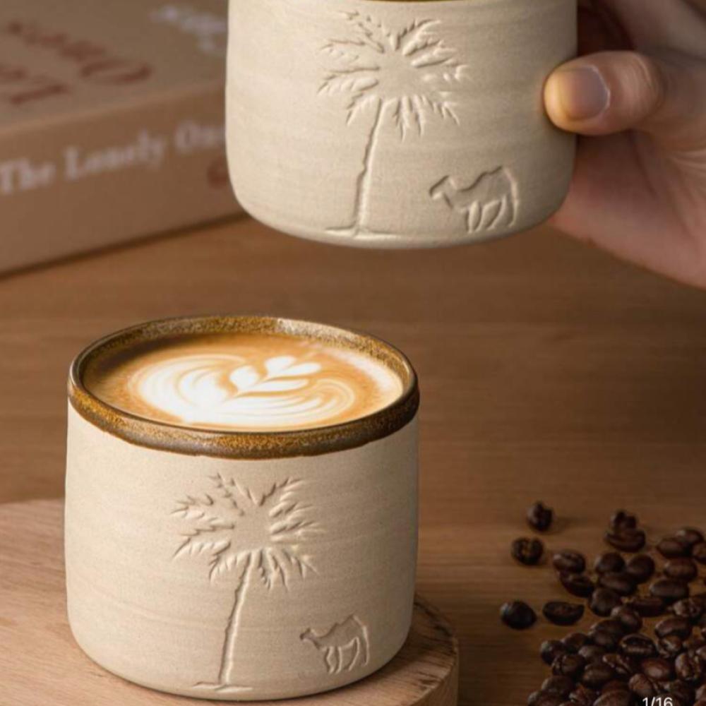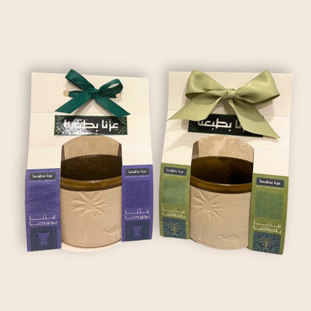 كوب القهوة المصنوع يدوياً من الفخار، والذي يجمع بين الأناقة والحرفية التقليدية السعودية. كل كوب يحمل نقشاً مميزاً لشجرة النخيل والجمل، رمز الأصالة والهوية السعودية، ليضيف لمسة من التراث في كل رشفة.